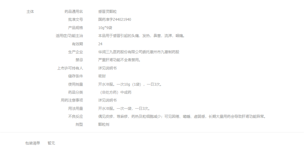 999 感冒灵颗粒10g*9袋/盒 解热镇痛 用于感冒引起
