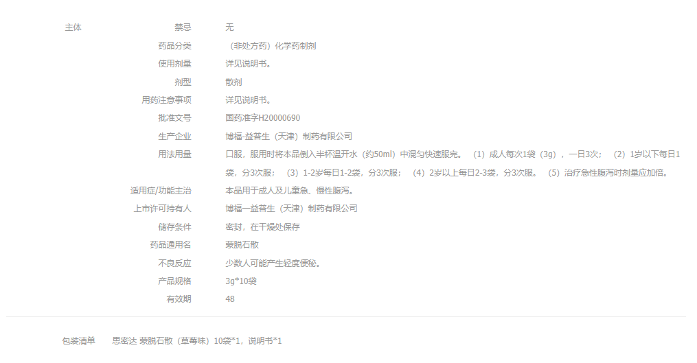 思密达 蒙脱石散3g*10袋 (草莓味) 慢性腹泻肠胃